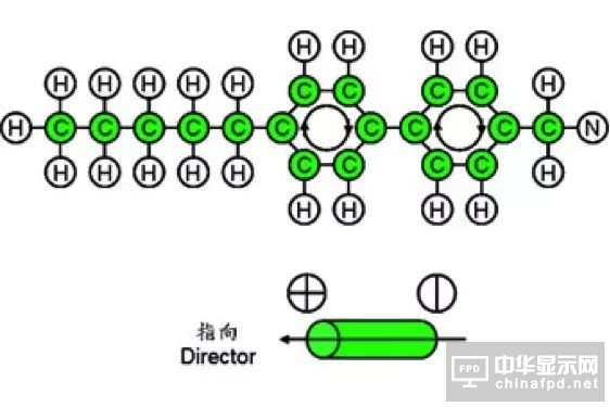 液晶分子為細長型棒狀結構,沿長軸方向具有“極性(Dipole)”,也就是分子的一端帶正電而另一端帶負電,如圖一(a)所示,圖中C代表碳原子、H代表氫原子、N代表氮原子,整個分子看起來是細長型棒狀結構,我們習慣將它簡化成圖一(b),其中箭頭稱為“指向(Director)”,箭頭的方向代表分子帶正電的一端。