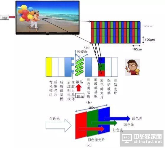 彩色濾光片:在塑料薄片上涂布紅(R)、綠(G)、藍(B)三種不同顏色的顏料,不停地反復排列在顯示器的整個畫面上,稱為「彩色濾光片(Color filter)」。彩色濾光片的原理如上圖四(c)所示,當白光(紅、綠、藍的混合光)通過「紅色的濾光片」,則只有紅光可以通過,綠光、藍光被吸收,所以眼睛只看到紅光;當白光通過「綠色的濾光片」,則只有綠光可以通過,紅光、藍光被吸收,所以眼睛只看到綠光;當白光通過「藍色的濾光片」,則只有藍光可以通過,紅光、綠光被吸收,所以眼睛只看到藍光,「濾光片」其實就是濾掉我們不要的顏色,只讓我們想要的顏色通過,值得注意的是,圖四(b)與(c)中的彩色濾光片只畫出一個像素來代表而已,實際上應該是紅(R)、綠(G)、藍(B)三種不同顏色,不停地反復排列在顯示器的整個畫面上,如圖四(a)所示。?