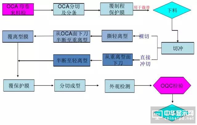 工藝流程OCA的全貼合流程相對水膠的全貼合流程要復(fù)雜一些,因為需要模切廠的介入。