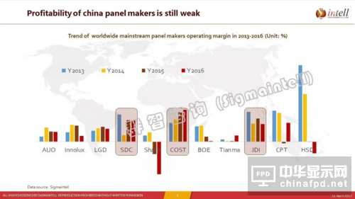 接下來是各廠商的營業利潤率,可以明顯看到各廠商的收益情況。先看BOE和天馬,由于中國廠商還在起步階段,技術水平還在逐步提升中,營業利潤率表現并不十分優秀。華星光電的營業利潤率表現是非常優秀的,主要是因為華星光電“效益最大化,成本最低化”,T1產線重點生產32英寸,T2產線重點生產55英寸,同時,還采用眾多國產化材料。SDC的營業利潤率很好,主要是它的手機OLED收益性非常好。另外,日本的JDI營業利潤率很好,主要是它的高端產品比較多,如LTPS的,供應蘋果等品牌廠商。LGD大尺寸OLED是在虧損,中小尺寸產品過多依賴蘋果,而蘋果的采購價格并不高。臺灣的兩家廠商,因為2016年年初遭遇了地震,所以整體營收是下降的,尤其是群創的下降幅度更大,主要是群創在中小尺寸方面沒有很強的競爭力。總的來說,中國廠商盈利性低于海外廠商。
