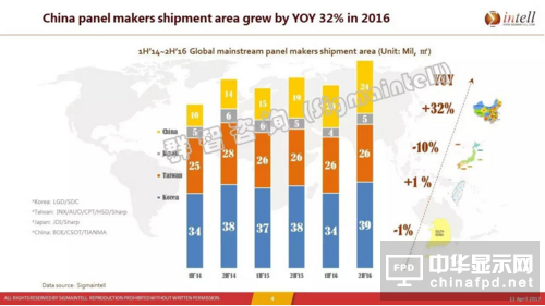 分地域來看,中國大陸增長30%,日本下降16%,臺灣地區下降13%,韓國下降了6%。中國大陸能有如此大幅的增長,主要是因為產能的快速增長,所以使整個營收額快速增長。另外,中國大陸產品結構也在不斷升級,如手機方面LTPS的占比大幅提升、大尺寸方面55英寸產品大幅增長。臺灣地區、日本、韓國的營收額都是下降的,韓國營收額下降的主要原因,一是SDC關閉產線,2015年關閉了一條5代線,2016年又關閉了一條7代線;二是LGD大尺寸產能從TFT-LCD向OLED轉移,因此產能也有所折損。當然,韓國的下降幅度整體低于日本和臺灣地區,這主要是得益于韓國的產品和技術有很好的競爭力。