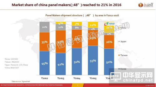 我想著重強調一下中國廠商在大尺寸面板出貨方面的成就。在TV面板方面,尤其是在48英寸以上,中國廠商有非常大的增長,主要是因為華星光電T2產能,從70K擴展到120K,而T2產線重點是生產55英寸。臺灣地區和韓國是下降的。韓國48英寸以上TV面板出貨下降,主要是因為2016年年初三星進行曲面相關產線改造,造成韓國占比的萎縮。