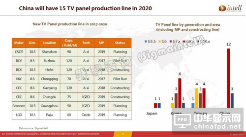 上圖我們統計的是各廠商產線建設、量產的情況。到2020年,群智咨詢(Sigmaintell)預計,中國將有15條TV面板面板生產線。新增的8條產線,7條在中國,其中10.5代線4條(BOE、華星光電、富士康),8.6代線3條(惠科、CEC 2條),8.5代線1條(BOE)。另外,LG在坡韓國州還有1條10.5代線。到2020年,整個中國已建和在建的TV面板生產線共計15條,包括12條8.5代線和3條10.5代線。到2020年,TV面板的生產將集中8.5代、10.5代等高世代線,因此中國將更適合TV面板的生產,具有更強的競爭力。