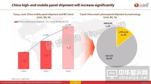 這一頁是各地區廠商的出貨面積。群智咨詢(Sigmaintell)數據顯示,2016年,中國面板廠商的出貨面積同比增加32%,日本面板廠下降10%,韓國與臺灣地區基本與去年持平。中國出貨面積大幅增長的原因,最主要是因為產能擴張,2016年,BOE的重慶,華星光電的T2由70K增長至120K,CEC的南京去年三季度已經滿產達到60K,LG廣州也從120K增長到了150K。日本出貨面積的下降,主要是因為Panasonic 8.5代線的關閉,導致日本產能的下降。