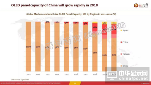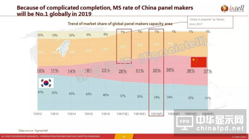 從各地區產能的占比來看,群智咨詢(Sigmaintell)預計,到2019年會形成中國大陸、臺灣地區和韓國三足鼎立的局面。中國將會以快速的增長來壓低韓國、臺灣地區的占比。目前,中國很多產品還在起步階段,我們預計,到2019年供應面積占比將達到35%,屆時三足鼎立的局面形成,真正的競爭將從這個時候開始,變得非常激烈。值得一提的是夏普,它被鴻海收購,屬于臺灣地區,所以2017年臺灣地區的占比有明顯提升。
