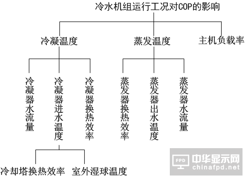 運行工況對冷水機組COP值影響包含以下因素:冷凝溫度、蒸發溫度、負荷率。冷凝溫度又取決于冷凝器流量、冷凝器進水溫度、冷凝器換熱效率(換熱溫差),蒸發溫度取決于蒸發器換熱效率(換熱溫差)、蒸發器出水溫度、蒸發器水流量。筆者在此梳理如下: