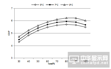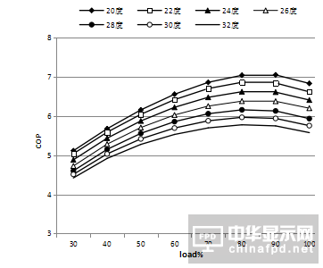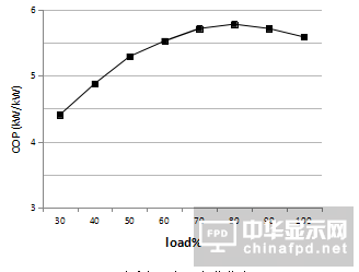 1. 離心式冷水機組的COP峰值往往不出現在滿負荷時,更多情況是負載率在70%~90%時,冷水機組性能最高;