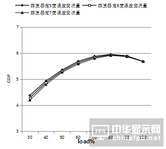在相同冷凝溫度下,蒸發器出水溫度不同也會對冷水機組COP產生影響。下面通過對三條性能曲線進行分析,整理出COP值隨蒸發器出水溫度變化而變化的規律。這三條性能曲線的分別代表運行工況為: