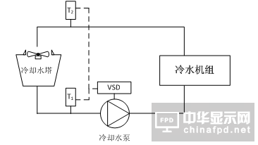 冷卻水變流量控制依據為定溫差控制(即下圖中T1-T2=定值),文獻[5]指出冷卻水流量變化的范圍主要有以下考慮:冷凝器內換熱管的經濟流速和冷卻水管上流量開關的限定。