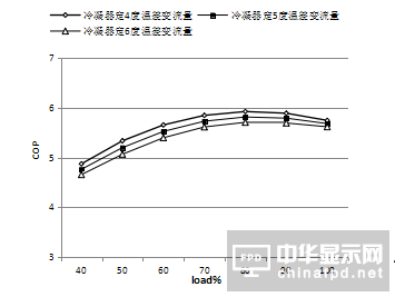 可以看到,當蒸發器側條件相同及冷凝器進水溫度一定時,冷卻水變流量對冷水機組性能影響較大。定溫差變流量控制下,隨著負載率的減少,冷水機組冷凝側的冷卻水流量逐漸減少,相對定流量運行而言,冷水機組COP下降在3%~8%。