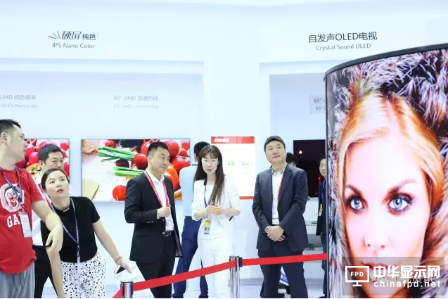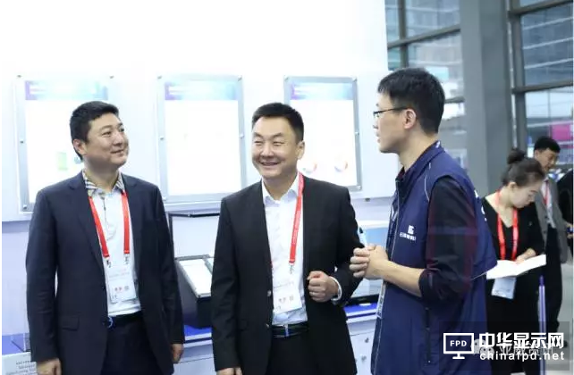 郭灝明秘書長、薛志堅副秘書長特別走訪了韓國LG Display、日本電氣硝子、龍騰光電、三利譜等企業,詳細了解了本次展會展示的最新產品與技術。其中,韓國LG Display工作人員詳細介紹了最新OLED產品與技術,重點介紹了曾在CES2017上展出的65吋OLED壁紙電視以及65吋自發聲OLED電視。OLED壁紙電視分辨率為3840*2160,色域高達99%,整體厚度不到3mm,深刻體現了其“OLED,未來顯示已來”的參展主題。