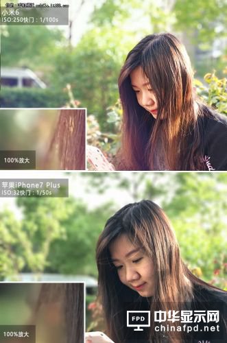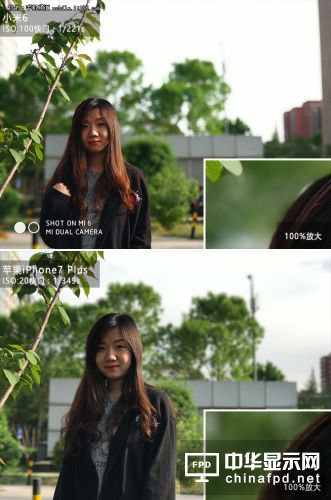 兩款手機在拍攝人像模式時,均自動切換長焦鏡頭作為主攝像頭,用廣角鏡頭來計算景深。從對比圖中能看出,iPhone7 Plus的人像模式僅僅是進行了背景虛化,而小米6則是在經過背景虛化的基礎上將人物進行了美顏,同時照片的色彩也更加濃郁,因此我們能明顯發現小米6拍出的人像照片更加討好眼球。