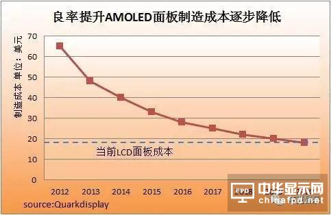 隨著AMOLED面板良率的提升,制造成本逐年下跌,2017年中小型AMOLED面板的制造成本與LCD面板相比,將縮小到20美元以內(nèi),到2020年成本可能比LCD還低。在AMOLED市場(chǎng)上,隨著中小型AMOLED面板的成本不斷下跌, 2018年AMOLED面板將規(guī)模量產(chǎn),AMOLED顯示面板在整個(gè)顯示產(chǎn)業(yè)的比重進(jìn)一步提升。