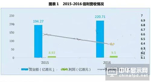 2016年信利營(yíng)業(yè)收入達(dá)到220.71億港元,同比增長(zhǎng)13.6%;利潤(rùn)值為9.50億港元,同比增長(zhǎng)6.4%。歷年保持一定的利潤(rùn)增長(zhǎng)使得信利成功入選2016年福布斯亞洲上市公司50強(qiáng)。