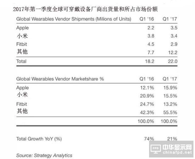 數(shù)據(jù)顯示,在2017年第一季度,Apple Watch的出貨量超過(guò)Fitbit,蘋(píng)果手表占全球市場(chǎng)15.9%份額,成為世界上最大的可穿戴設(shè)備廠商。Fitbit在該季度的可穿戴設(shè)備出貨量約為290萬(wàn)部。作為蘋(píng)果的勁敵,小米可穿戴設(shè)備出貨量約為340萬(wàn)部。