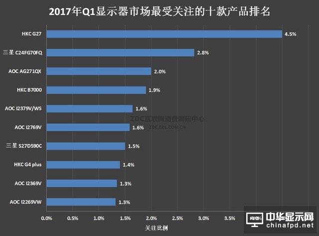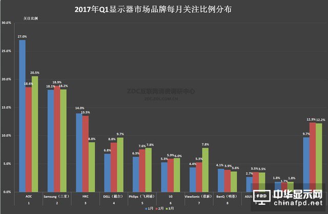 根據ZDC互聯網數據顯示,2016年中國液晶顯示器市場品牌關注Top10分別是:AOC、Samsung(三星)、HKC、DELL(戴爾)、Phillips(飛利浦)、LG、ViewSonic(優派)、BenQ(明基)、ASUS(華碩)、Lenovo(聯想)。其中,AOC以22.1%的成績成為了2017年Q1最受關注的顯示器品牌,三星、HKC分別位列第二、第三。