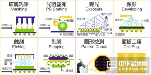 講完零組件,怎么可以忘了設備? LCD的Array制程順序依序為成膜>曝光>顯影>蝕刻>剝膜。