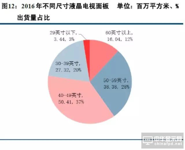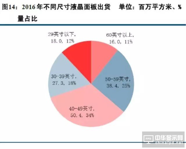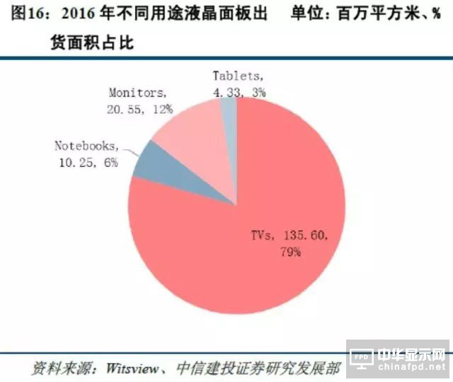 按照液晶面板用途進行分類可以看出,2014年以來液晶面板出貨增長主要集中在電視屏幕液晶面板領域,2016年液晶面板出貨面積中電視屏幕占到79%,而電視屏幕主要為大屏,2016年電視液晶面板出貨量中大屏(30英寸以上)占據97.46%。由此可見,液晶材料在大屏領域仍占據顯著優勢。