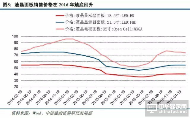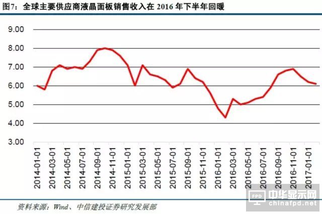 數據顯示,2016年出貨面積增長率也僅為4.64%,沒有如預期出現周期性的反轉。我們發現原因主要是2016年是奧運年,受全球電視需求預計大幅增長的影響,液晶面板企業在2015年進入補庫存周期,大量備貨。2016年液晶面板企業庫存積壓嚴重,全球范圍內液晶面板價格在2016年也來到低位。我們判斷伴隨著庫存的消化,整個行業在2017年將會擺脫2016年奧運會的影響,全面進入高增長的波峰階段。數據也證實了我們的觀點,從2016年下半年開始全球液晶面板出貨面積開始增長復蘇,2017年1月和2月全球液晶面板出貨面積同比增長分別達到11%和17%,標志著10%以上增長時代的重新來臨。同時,行業數據顯示,液晶面板行業銷售價格和銷售收入在經歷了2016年年中的低點之后已經在2016年下半年顯示出回升跡象。
