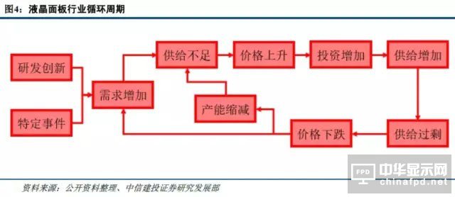 液晶面板行業具有較為明顯的周期性特征。每當研發創新、面板主流尺寸更替以及特定事件如奧運會、世界杯時,通常會出現需求增加、供給緊俏、價格上揚的狀態,市場氣氛跟著樂觀,導致廠商投資增加甚至過度投資;一旦銷量不及預期或待景氣自然出現反轉下滑,產能過剩的窘境隨即出現,產品價格開始下跌,廠商被迫減少或停止投資,直到景氣降到谷底。接著,再經過一段時間的調整,受特定事件的觸發,市場需求再度復蘇,直到供給無法滿足需求之際,產品價格重新上揚,廠商又開始進行新世代產線投資,如此便完成一個所謂的液晶周期。另外不同于其他周期性行業的是,液晶面板產能的過剩能夠創造更多的市場需求。面板廠商面對過剩的產能往往考慮將其應用于更多元化的應用領域,例如向更大尺寸的電視面板或者更多顯示終端如移動多媒體和新型智能終端延伸,新需求的快速蔓延和市場的打開會加速液晶面板行業循環發展。