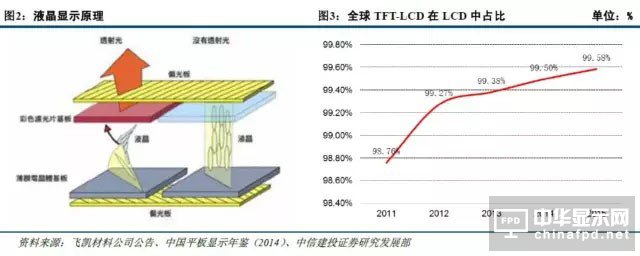 液晶顯示技術在經歷了DSM-LCD、TN-LCD、STN-LCD后,目前TFT-LCD(薄膜晶體管液晶顯示技術)已經成為主流技術。其基本原理是在兩片平行的玻璃基板當中放置液晶盒,下基板玻璃上設置TFT(薄膜晶體管),上基板玻璃上設置彩色濾光片,通過TFT上的信號與電壓改變來控制液晶材料分子的轉動方向,從而達到控制每個像素點偏振光出射與否,以達到顯示之目的。根據《中國平板顯示年鑒(2014)》的數據,2013年全球LCD面板產值(包括TFT-LCD和PM-LCD,其中PM-LCD即被動矩陣式LCD,包括TN-LCD、STN-LCD、DSTN-LCD)為1145.5億美元,TFT-LCD占比99.38%;2015年全球LCD面板產值為1298.2億美元,TFT-LCD占比99.58%。