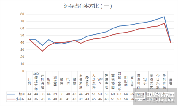 測試方法簡單粗暴,一加3T和小米6依次打開20款應(yīng)用,觀察其運存的占用率,運存占用率一定程度上可以反映出廠商的運存調(diào)教機制,以及當(dāng)前的系統(tǒng)流暢度。