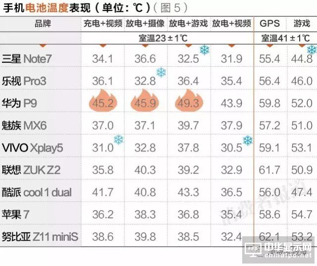 在國際標準IEC 62133:2012中也有相關描述,10℃至45℃是鋰離子電池通常情況下的工作溫度范圍。但在實驗室實際測試情況下,華為P9的電池溫度均超過了45℃。#p#分頁標題#e#