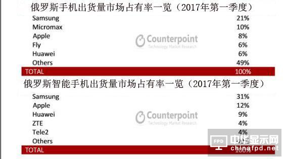 另一家中國廠商華為的手機出貨量份額為9%,俄羅斯國內品牌Tele2的出貨量份額增長到4%。