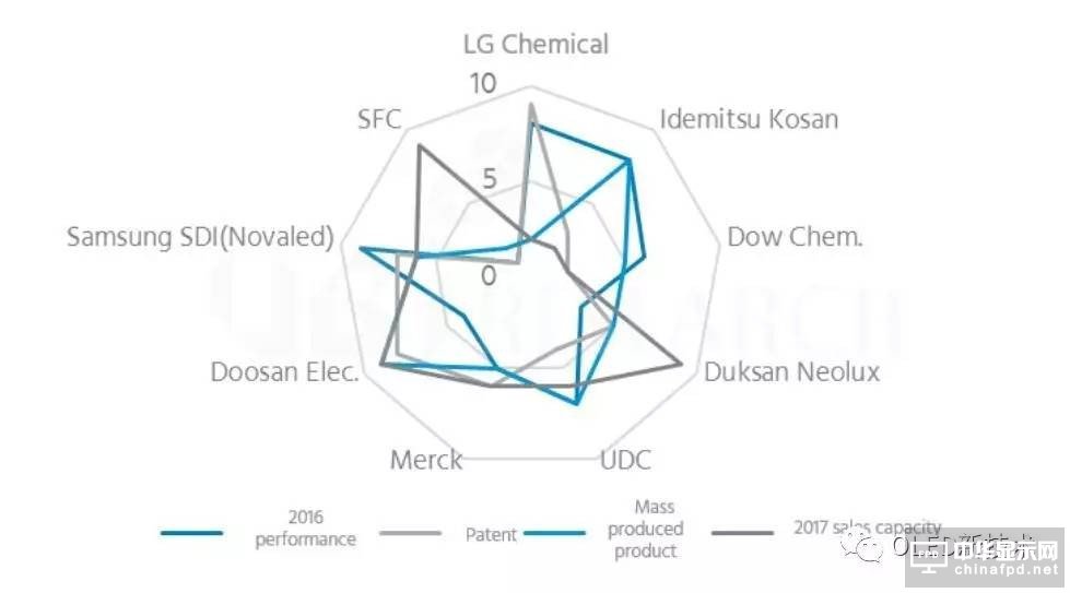 排名第二的公司為Samsung SDI,第三名為UDC,另外受益于三星Galaxy S8深紅色host材料的導入,Duksan的競爭力也較去年有了明顯的提升,目前排在第四位。