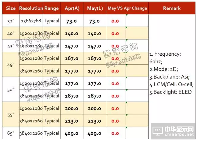 2. 39.5"~43"尺寸段,面板價(jià)格維持高位,需求持續(xù)減少,而供應(yīng)面增加帶動(dòng)供需趨于寬松,5月份價(jià)格持平,但群智咨詢(xún)(Sigmaintell)認(rèn)為未來(lái)價(jià)格繼續(xù)維持的壓力較大。