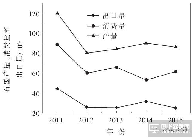 圖3 2011-2015年中國石墨產(chǎn)量、消費(fèi)量和出口量變化趨勢(shì)