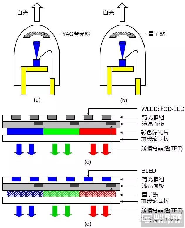 傳統(tǒng)白色發(fā)光二極管(WLED)發(fā)光的原理是以藍(lán)光發(fā)光二極管(Blue LED, BLED)晶粒發(fā)出藍(lán)光照射 YAG 熒光粉,熒光粉吸收藍(lán)光產(chǎn)生白光,如圖五 (a) 所示,前面提到這種組件的 RGB 顏色受限,可以組合成的顏色仍然不夠多,因此我們可以直接使用量子點(diǎn)(QD)取代熒光粉稱(chēng)為“量子點(diǎn)發(fā)光二極管(QD-LED)”,如圖五 (b) 所示,利用這種組件為液晶顯示器(LCD)的背光源可以增加 RGB 顏色,如圖五 (c) 所示,因此可以組合成的顏色大大增加,而且并不需要修改太多液晶顯示器(LCD)的構(gòu)造,成本最低,但是仍然必須使用彩色濾光片。
