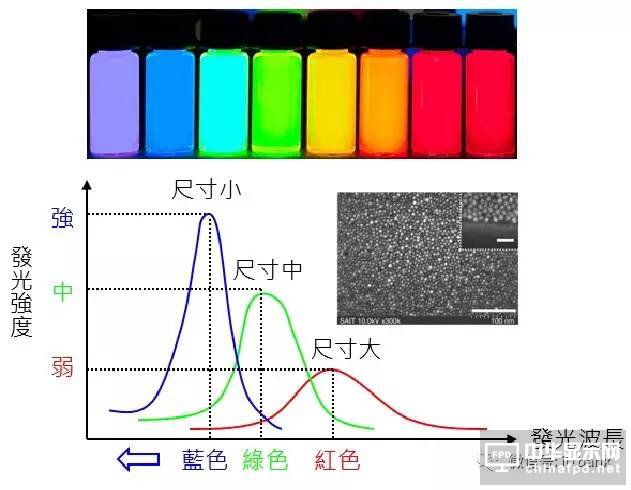 科學(xué)家發(fā)現(xiàn)當(dāng)材料的尺寸小到 100 納米以下時(shí)會(huì)產(chǎn)生“量子局限效應(yīng)”(Quantum confinement effect),此時(shí)電子與電洞被局限在納米材料內(nèi)形成自組的穩(wěn)定態(tài),造成發(fā)光性質(zhì)的改變,而且納米材料的尺寸愈小時(shí),材料發(fā)光強(qiáng)度愈強(qiáng),發(fā)光的波長(zhǎng)愈短(藍(lán)色),這個(gè)現(xiàn)象稱(chēng)為“藍(lán)移”(Blue shift),如圖四所示,不同顏色的光波長(zhǎng)不同,所以光的波長(zhǎng)就是顏色,在可見(jiàn)光中紅光的波長(zhǎng)最長(zhǎng),綠光次之,藍(lán)光最短,換句話(huà)說(shuō),當(dāng)納米材料的尺寸大,發(fā)光強(qiáng)度較弱,顏色為紅光(波長(zhǎng)最長(zhǎng));當(dāng)納米材料的尺寸變小,發(fā)光強(qiáng)度變強(qiáng),顏色為綠光(波長(zhǎng)次之);當(dāng)納米材料的尺寸更小,發(fā)光強(qiáng)度更強(qiáng),顏色為藍(lán)光(波長(zhǎng)最短)。
