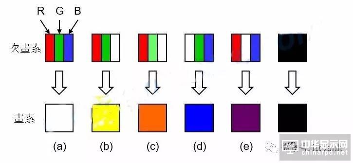 在了解顯示原理前,我們先來(lái)理解一下各式顯示技術(shù)中彩色是如何達(dá)成的,他們均是以紅(Red,R)、綠(Green,G)、藍(lán)(Blue,B)3 種顏色“不同亮度”即可組合成連續(xù)光譜中幾乎所有可見(jiàn)光的顏色,因此我們稱(chēng)紅、綠、藍(lán)三色為“光的三原色”。如圖一所示,假設(shè)有一個(gè)方格用來(lái)顯示某一種顏色,這樣的方格稱(chēng)為“像素”(pixel),將這個(gè)方格垂直切割成三個(gè)小方格,分別代表 RGB 3 種顏色,這樣的小方格稱(chēng)為“次像素”(Sub-pixel)。