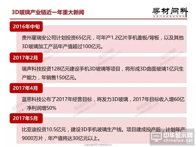 2016年中旬,貴州星瑞安計劃投資65億;2017年2月,瑞聲科技投資128億;2017年5月,比亞迪投資10.5億,都是手機3D玻璃相關(guān)項目。行業(yè)人士預(yù)測,2018年全球智能手機出貨量為15.5億支,3D玻璃蓋板滲透率達(dá)到25%,約為3.9億片,未來市場空間巨大!