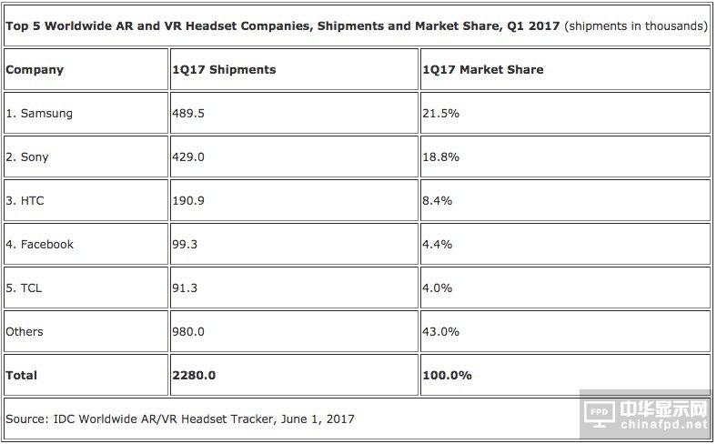Facebook和TCL排在第四和第五位,這兩家公司的Oculus Rift和阿爾卡特VR頭盔出貨量分別為10萬部、9.1萬部,市場份額為4.4%、4.0%。