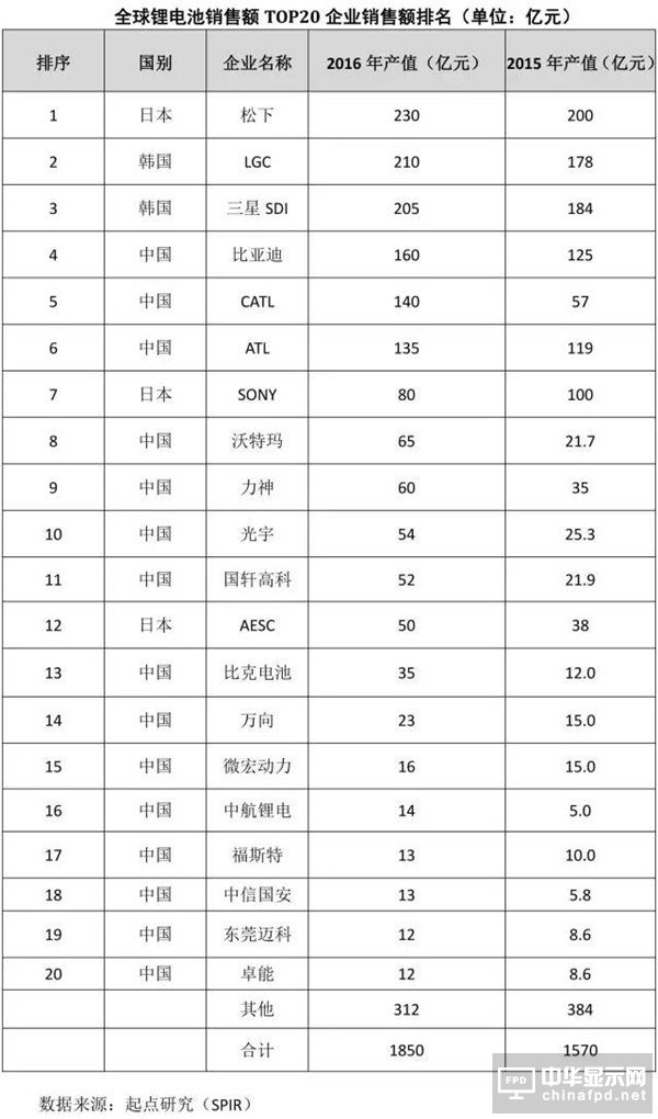 韓國企業占據兩家,分別是三星SDI、LG化學,其余15家均為中國企業。