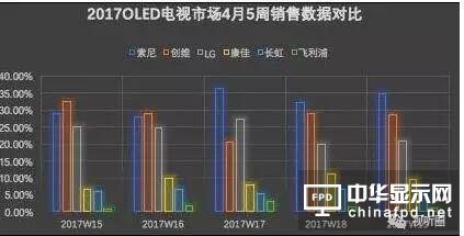 據(jù)中怡康數(shù)據(jù)顯示,在4月5周OLED電視銷量數(shù)據(jù)顯示,從第15周,索尼OLED電視A1上市一周市場(chǎng)占比便已緊逼創(chuàng)維。17周之后,已大幅超過(guò)LG、創(chuàng)維兩大品牌在OLED電視市場(chǎng)的份額,成為真正OLED電視的銷量擔(dān)當(dāng)。