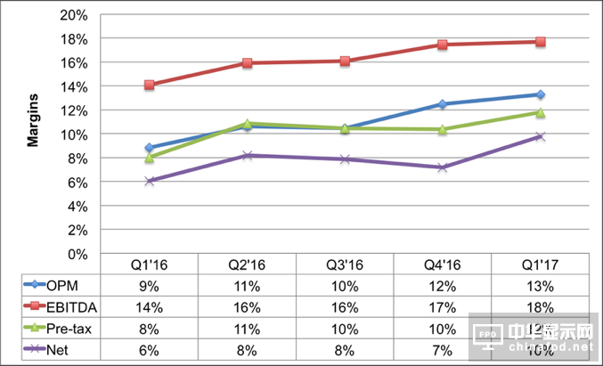 Figure 3: Q1’16 – Q1’17 Margins for Display Equipment Suppliers