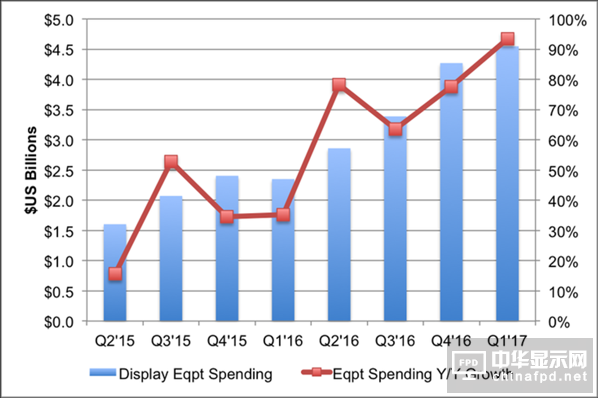 如圖1所示,2017年第一季度隨著顯示市場資本支出季度增長8%,年度增長106%的趨勢下,設備市場季度增長6%,年度增長93%,達45億美金規模。DSCC 首席執行官Ross Young說道:“顯示設備市場史無前例的增長,是由于兩個主要的投資周期同時發生。