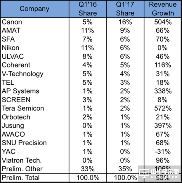 如圖2所示,Canon在2017年第一季度以16%的份額成為領先設備廠商,年度增長超過500%,在光刻與蒸鍍設備類別中占比超過50%的份額。Cannon自2014年第三季度起第一次銷售曝光機數量超過Nikon,他的子公司Tokki在OLED蒸鍍市場占據主導地位。AMAT由于在CVD和柔性顯示OLED無機PECVD封裝領域的優勢位居第二。
