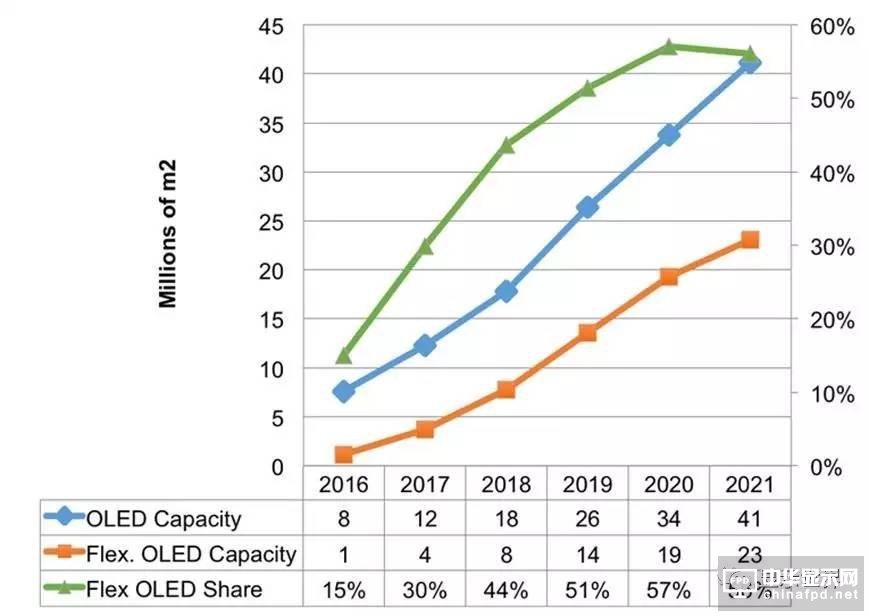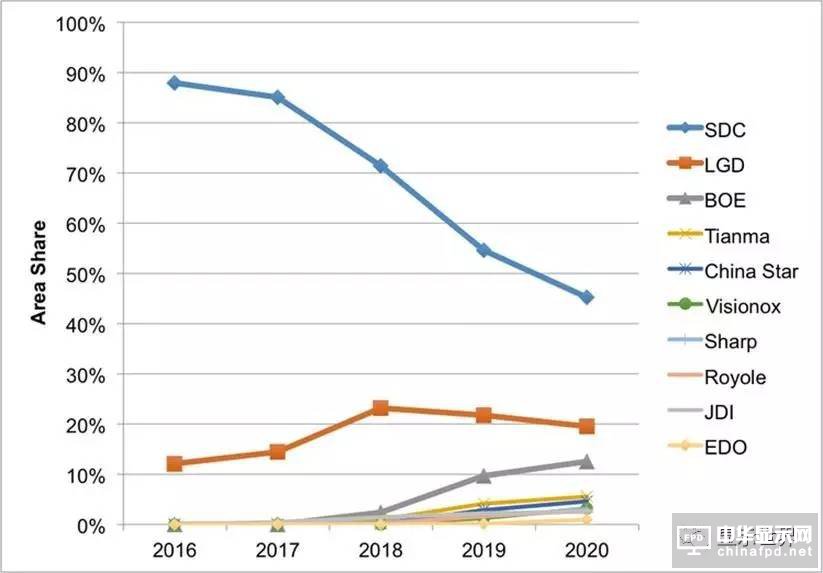 DSCC’s Display Capex and Equipment Service 報告通過累積式數據在產房設備的規劃,按照不同的公司,技術,區域,基板尺寸等檢視工廠產能。如圖4所示,OLED投入產能年復增長率預計為40%,達到4千1百萬平方米,柔性顯示OLED投入產能年復增長率為82%,達2千3百萬平方米,占OLED 56% 產能份額。柔性顯示OLED投入產能預計將在2019年趕超LTPS LCD的投入產能。以OLED產能來看,三星首當其沖,但是由于LG著重在TV,將消耗較大面積,LG有可能在2021年追上三星,依賴于10.5代OLED工廠上線的確切時間。然而,以柔性顯示OLED產能看,三星并不希望很快陷入,在2021年僅占據40%份額,BOE緊隨LG位居第三,如圖5所示。