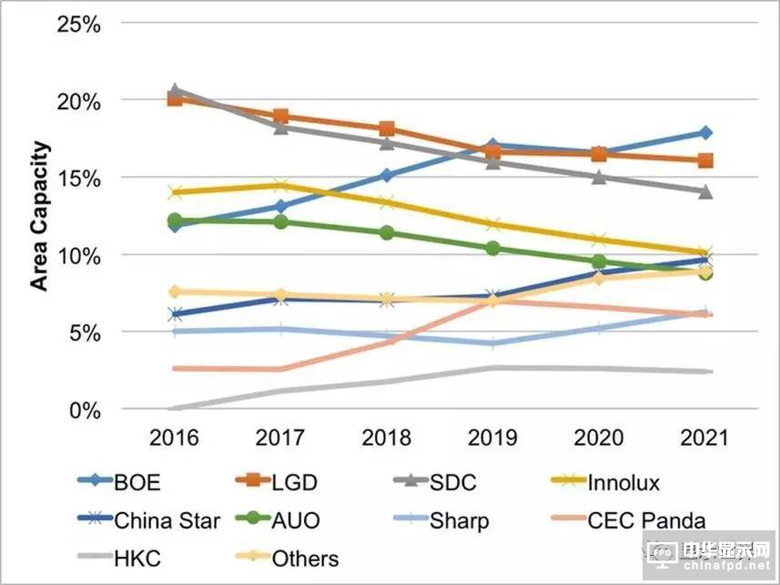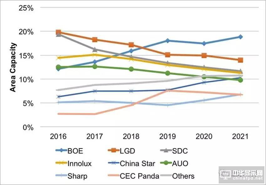 以所有顯示產能來看,假設到2021年間沒有任何工廠關閉,LCD產能預計年復增長率在6.6%,按區域來看,如圖6所示,中國將從2017年位居領先位置并在2021年達到近一半全部顯示產能。以廠商來看,LCD與OLED產能一起,BOE將從2019年起位居領先位置,但與與LG之間的差距非常小,如圖7所示。然而如果我們只看LCD產能如圖8所示,BOE在2021年的優勢將擴展到5%的空間。