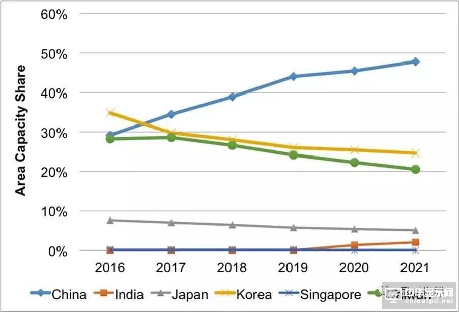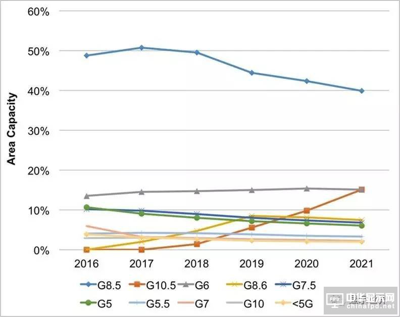 如圖9所示,8.5代線長期占據主導市場,然而,10.5代線增長迅速預計在2021年趕超六代線,占15%份額,六代線從2017-2021年間穩定在15%市占率左右,五代線以下的世代線將掉至2%并且有較多將會關閉。