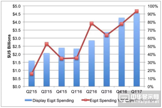 如圖1所示,2017年第一季度隨著顯示市場資本支出季度增長8%,年度增長106%的趨勢下,設備市場季度增長6%,年度增長93%,達45億美金規模。DSCC 首席執行官Ross Young說道:“顯示設備市場史無前例的增長,是由于兩個主要的投資周期同時發生。第一個周期來源于OLED在智能手機應用替代LCD的市場,這個周期預計將會持續到下個5年間,主要供給智能手機市場以及等同于2-5倍LCD工廠成本的資本密集型柔性顯示OLED工廠。OLED投資將一直會持續,不僅僅是因為OLED顯示畫質,能夠減輕重量以及縮小厚度等優點,同時也是由于能夠實現柔性顯示,可彎曲可折疊產品的形態,這些產品能夠給OLED面板廠商以及手機品牌廠商帶來較高的利潤和營收,也是較難替代的市場。第二個周期來源于60寸與大尺寸4K TV面板供給緊張,未來數年將至少有五座10.5代線產生來解決產品價格以及成本問題。這些世代線投資較高,驅動了顯示設備市場到達高點”。