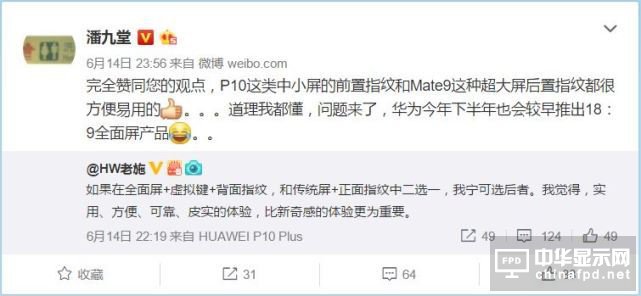 不過,現(xiàn)在似乎目前業(yè)內(nèi)還沒有找到全面屏手機正面指紋解鎖的完美解決方案,所以即便榮耀Note 9確實采用了全面屏設(shè)計的話,那么指紋識別的位置也應(yīng)該會如三星GALAXY S8系列那樣設(shè)計在手機的背面。而也正是這個話題,才引發(fā)了@潘九堂披露華為下半年較早推出全面屏新機的爆料。