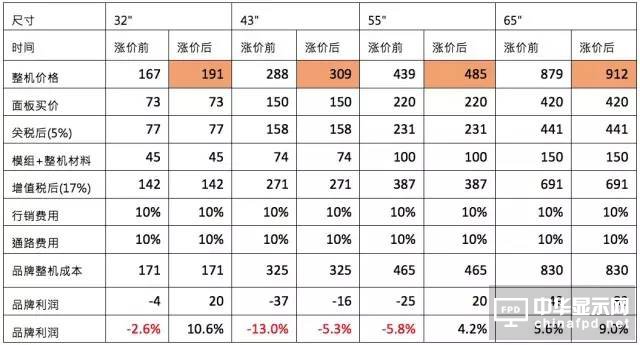 這張表可以看出,如果不漲價的話,上面列的尺寸全部虧損,唯獨65吋還有獲利空間。品牌獲利好,再來電視本來就再往大尺寸方向走,這是一個擋不住的趨勢,所以65吋也成為少數在五一還賣得好的尺寸。