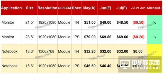 整體來看,根據群智咨詢(Sigmaintell)預測,7月份MNT面板供需寬松,面板價格穩中略降。7月份21.5"FHD TN價格下降,23.8"FHD IPS面板價格也將開始下降。