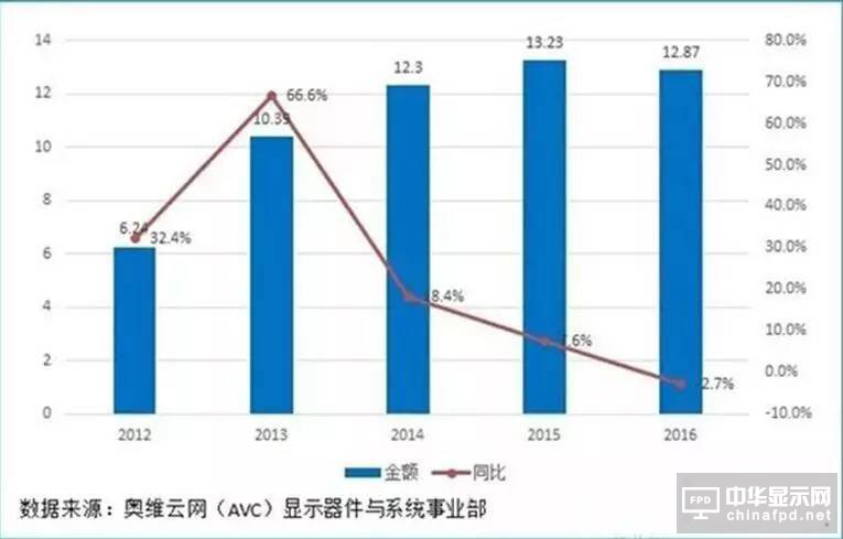目前我國已是全球最大的LED顯示屏生產制造基地,我們的LED顯示屏企業包攬全世界80%以上的LED顯示屏,有160多個國家從我國采購LED顯示屏。近幾年,據相關數據顯示,我國LED顯示屏產品出口市場規模從2012年的6.24億美元增長至2016年12.87億美元,年均增幅24.5%。