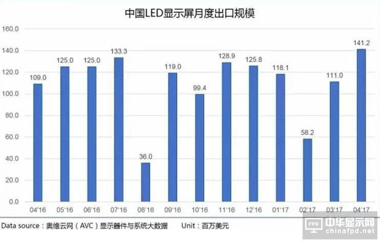 而最新數據顯示,2017年4月,我國LED顯示屏產品出口市場規模更是高達1.41億美元,創下單月歷史新高,同比增長29.5%,環比增長27.2%。從增幅上看,4月份同比增速較上月上漲10個百分點。